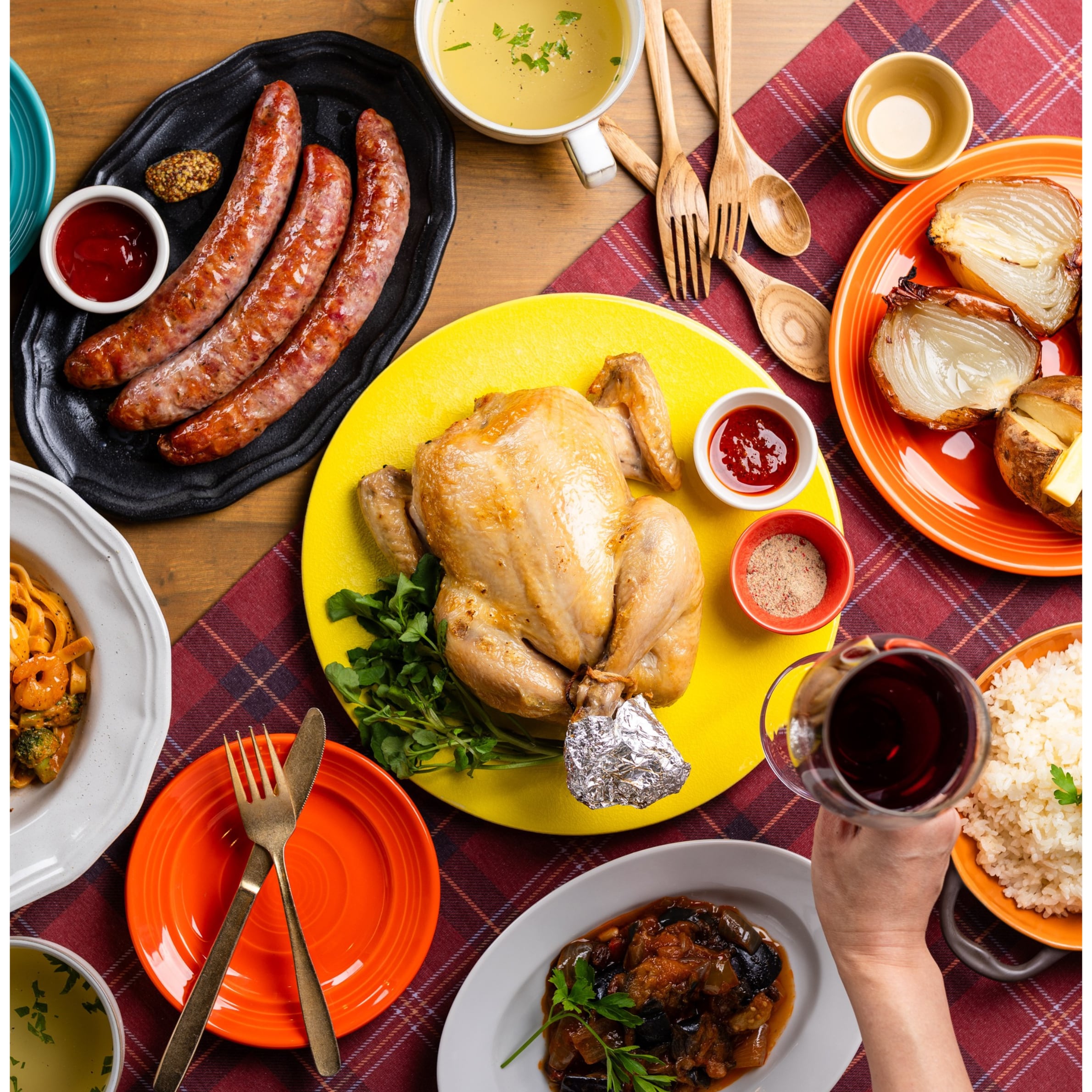 レストランE‘VOLTAの姉妹店であるLA COCORICOの名物『ロティサリーチキン』を特別な日にお手軽にお愉しみいただけるよう、豪華なセットにしてご用意致しました。ボリューム満点の丸鶏が存在感抜群で食卓がぐっと華やかに!