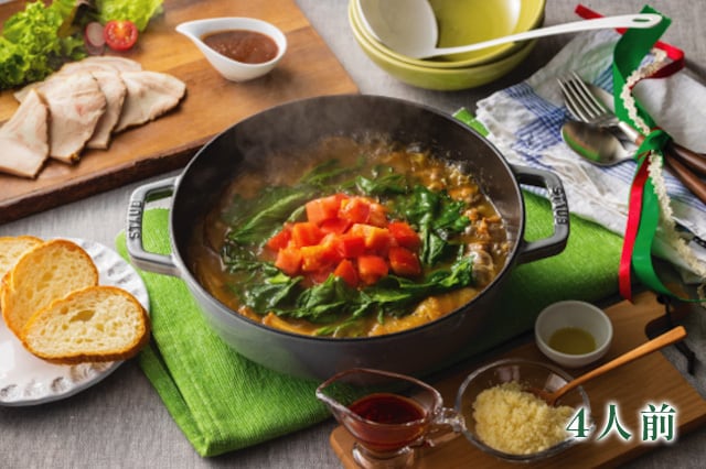 野菜と豚肉を煮込んだ北イタリア・ロンバルディア地方の家庭料理〈カッスーラ〉をベースに、日本の食卓に合うようエボルタ流アレンジを加え、フルコースを楽しめる鍋メニューに仕上げました。